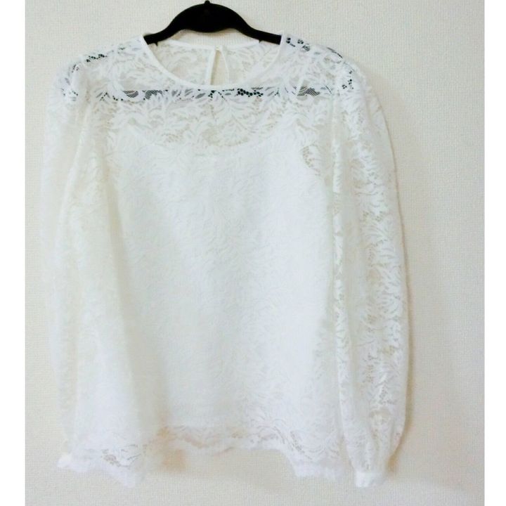 肩の部分にギャザーの入っているデザインなので、より女性らしくエレガントな印象を演出してくれます。レースのブラウスなので伸縮性はありません。着心地の良さを求めるならワンサイズ大きめでもいいかもしれません。