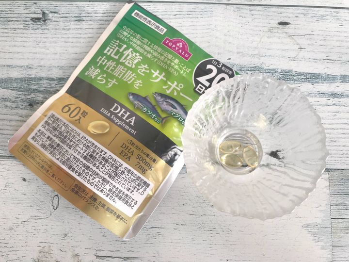 マグロやカツオに多く含まれているといわれているDHAだ1日3粒のサプリメントで摂取できる「記憶をサポート 中性脂肪を減らす DHA」(1944円)