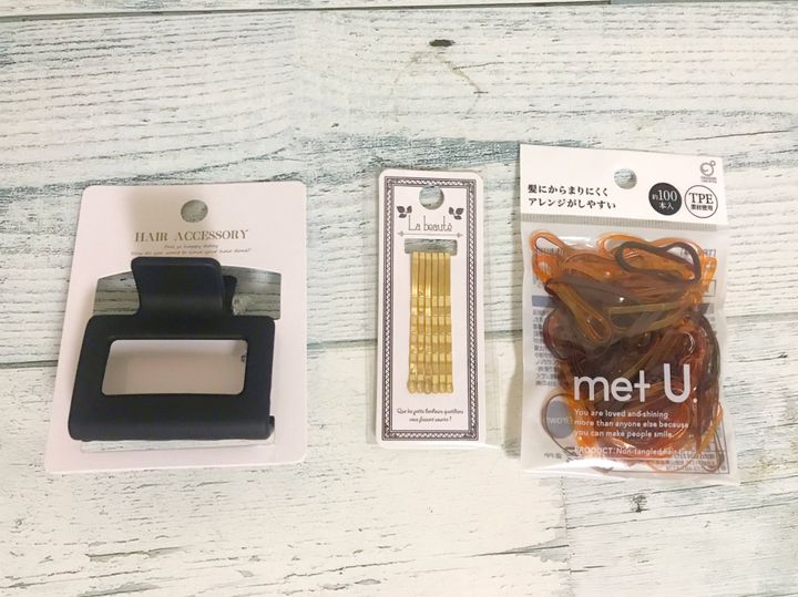 キャン★ドゥで購入したヘアアクセは3点。ヘアクリップ、アメピン、シリコンゴムを購入しました。どの商品も110円で購入。