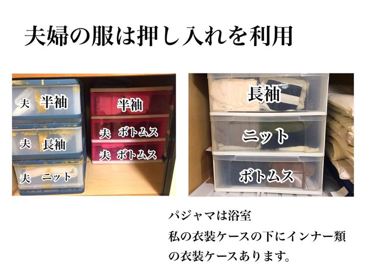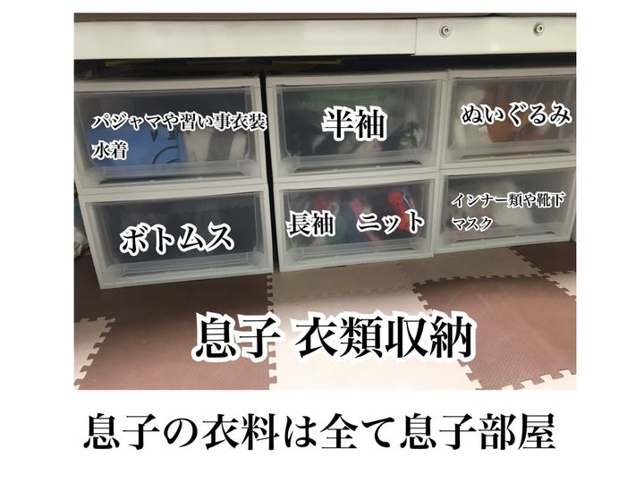 我が家のお洋服収納は私と主人の服は押し入れに、息子の服は息子の部屋のベッド下に引き出しタイプの衣装ケースに収納するようにしています。