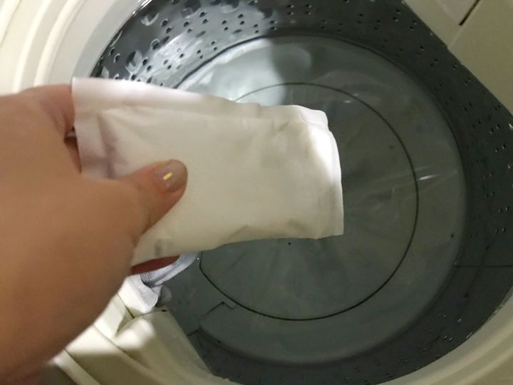 縦型洗濯機の場合、この袋ごと洗濯機に投入するだけでOK。(ドラム式の場合は袋の中身だけを投入します。)