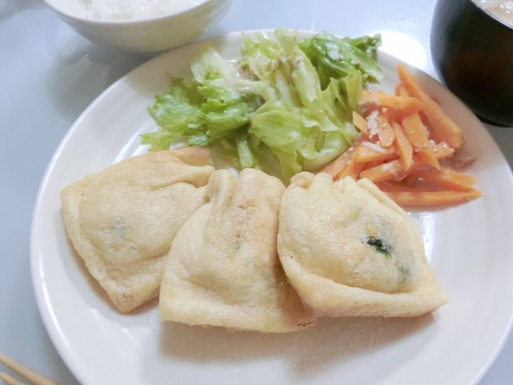 コロッケを一から作ると小麦粉卵にパン粉をまぶして、さらに油で揚げるので手間も時間もかかりますが、油揚げを使う事で時短にもなるし後片付けも楽になります。