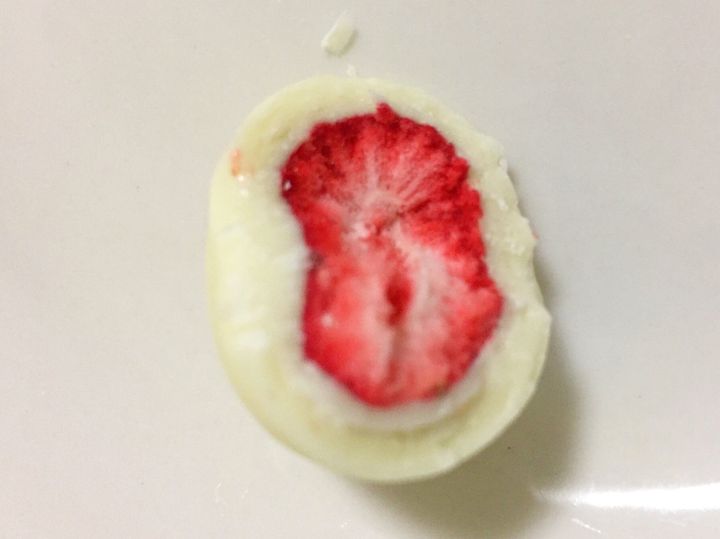 中の乾燥いちごは少し酸味があり、チョコレートの甘さをうまく緩和してくれます。