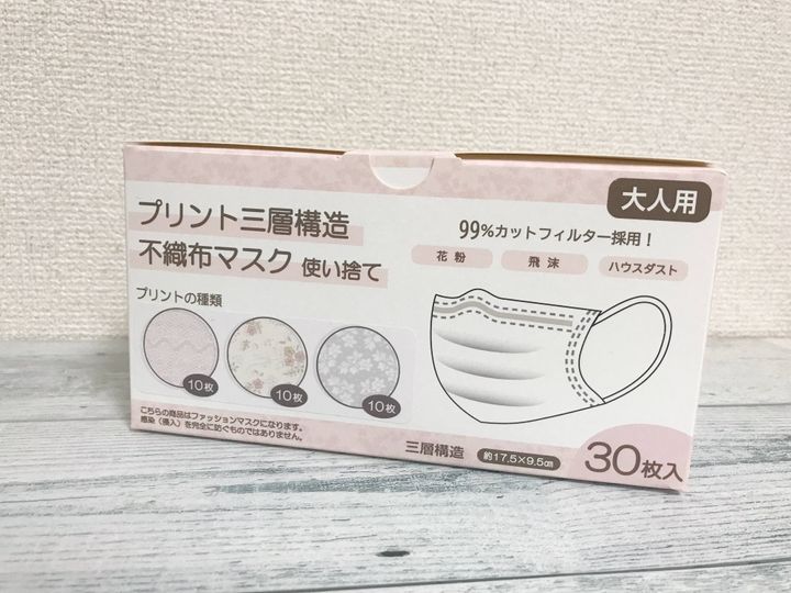 3種類の柄がそれぞれ10枚づつ、30枚入りの不織布マスクです。