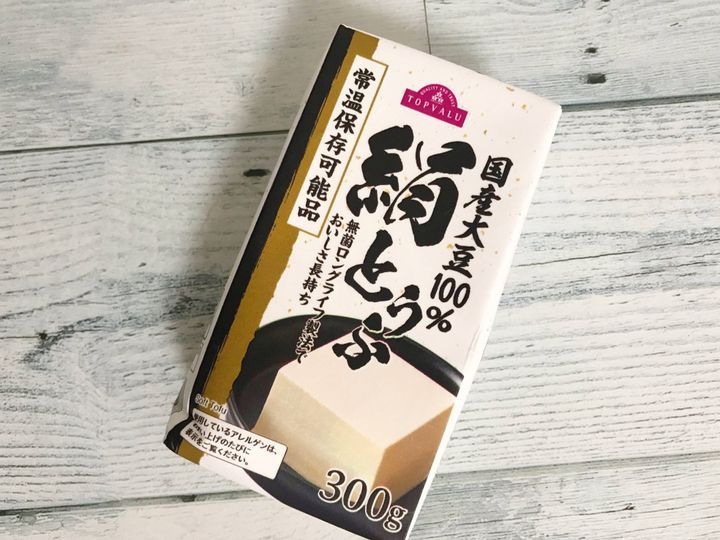「トップバリュ 国産大豆100% 絹とうふ」(138円 税込)は普段購入するお豆腐よりも長期保存に対応しているので、常備しておくのにもおすすめの食材です。