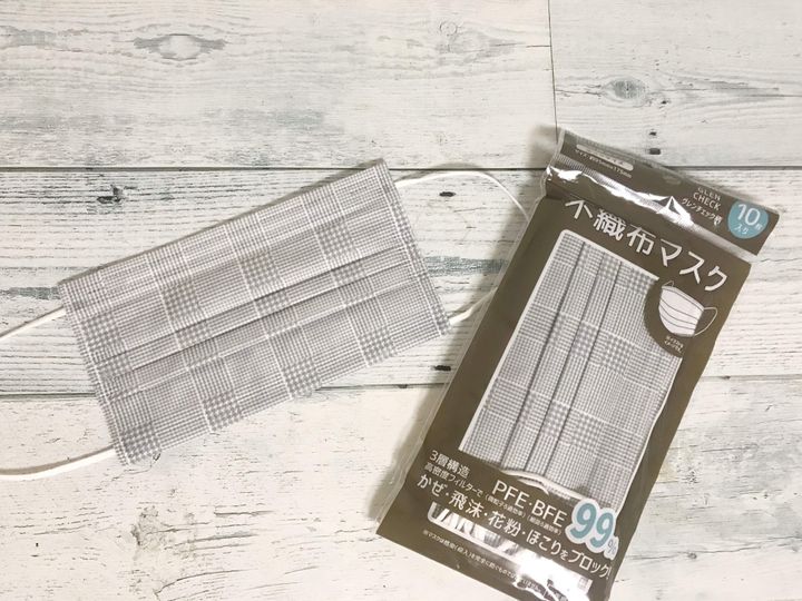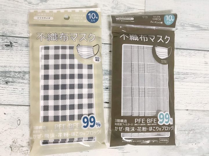 不織布マスク ギンガムチェック柄(110円 税込)と不織布マスク グレンチェック柄(110円 税込)。