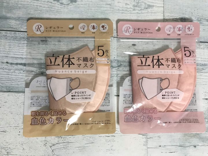 DAISOで発売されている「立体不織布マスク」(110円 税込)カラーは肌を明るく見せる血色カラーを2パターン購入しました。