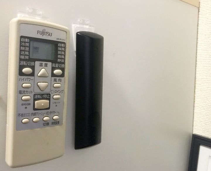 テレビやエアコンなど家電のリモコン収納を壁に作れるフックです。貼れる壁面は光沢のある平らな面(鉄・ステンレス・ガラス・メラミン化粧板・プリント合板)ビニル製壁紙。