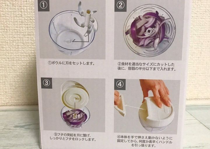 使い方はいたってシンプル。調理したい食材をざっくりとカットし、ハンディチョッパーに入れてフタのハンドルを引っ張るだけ。引っ張る回数が多ければ多いほど細かくカットされます。