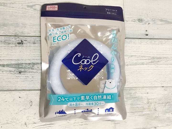 DAISOで発売された「クールネック」(1,100円)は24℃以下で素早く自然凍結するのが特徴。冷蔵庫や冷凍庫、流水で本体を冷やし首に巻いて暑さ対策が出来ます。