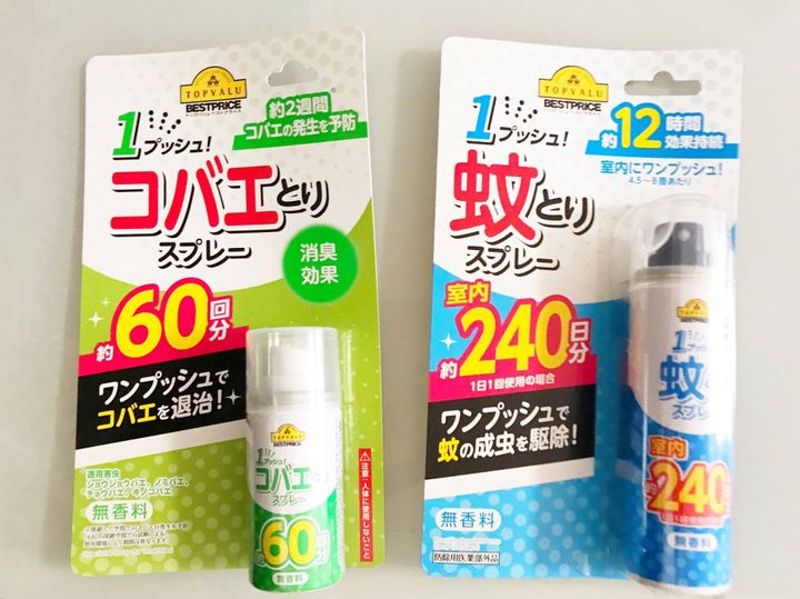 コバエとりスプレーは767円で約60回分、蚊とりスプレーは877円で約240日分です。