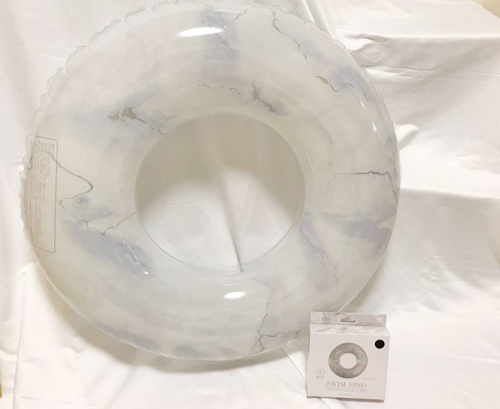 「マーブル柄浮き輪」(330円)はシックな大理石柄の浮き輪。年齢問わず使いやすい大人っぽい柄の浮き輪が330円とプチプライスで購入できます。カラーはグレーとブルーの2色展開。筆者はグレーを購入しました。