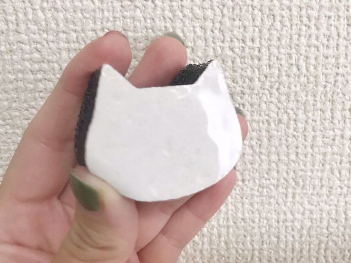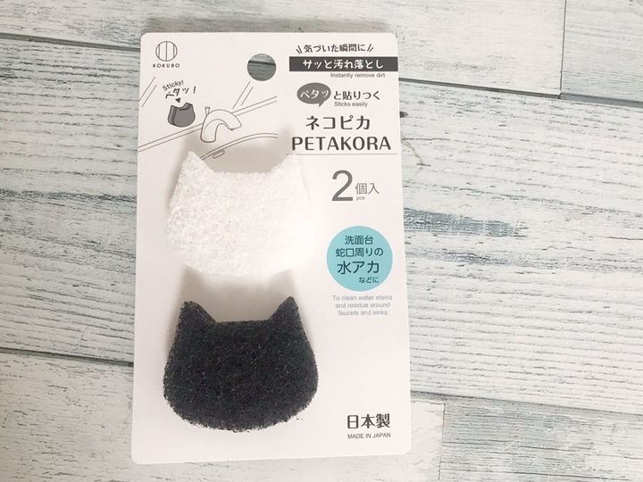 今回ご紹介するのが「ペタッと貼りつくネコピタ PETAKORA」(110円)。洗面台や蛇口回りの水アカのお掃除などにピッタリのお掃除アイテムです。白猫と黒猫の2個セット。モノトーンなのでインテリアにもなじみやすいデザインなのもおすすめのポイントです。