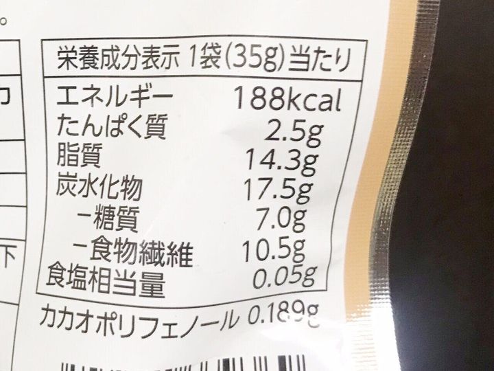 エネルギーも一袋188kcalとチョコレート菓子にしては低め。これなら数粒食べても安心なのでダイエット中でも罪悪感なく口にすることが出来ますよね。