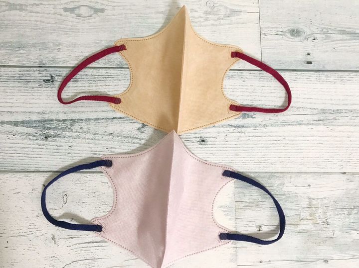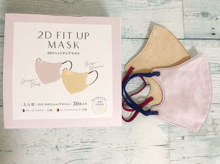 今回ご紹介するのが「2Dフィットアップマスク 30枚入り」(330円)。「グレージュ×ネイビー/ベージュ×ワインレッド」を購入しました。他にも「ピンク/ベージュ」が販売されています。オンラインで人気なのは今回筆者が購入した耳ヒモとマスクのカラーがバイカラーになっているタイプ。
