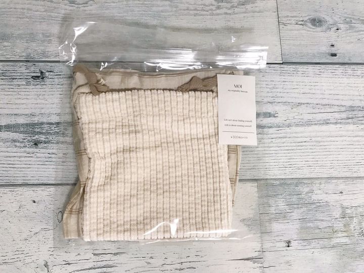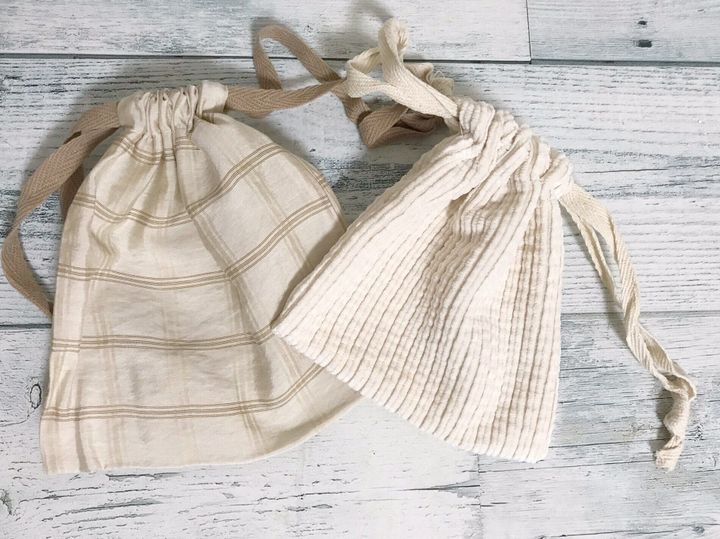 「チェックコーデュロイ巾着2個セット」(330円)は小さめの巾着が2個セットで販売されています。筆者が購入したのはアイボリー/ホワイト。他にもマスタード/パープル・ピンク/グリーン・グリーン/オレンジの全4種類展開で販売されています。