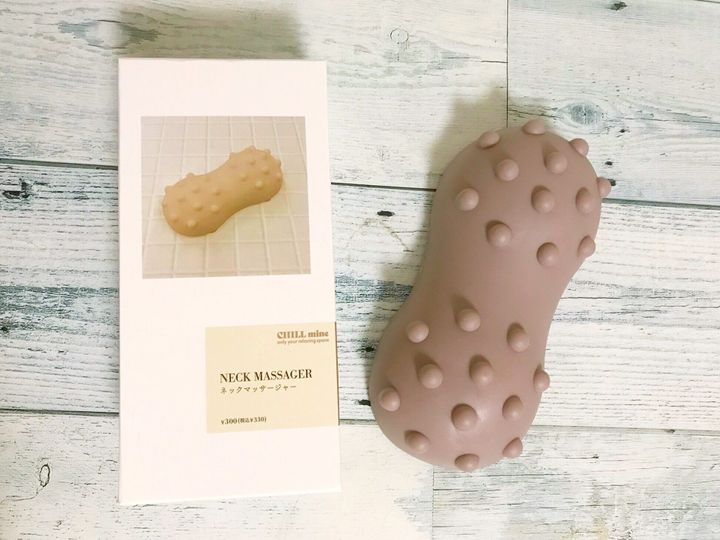 首や肩が凝っていて、グッと押してほしい! そんな願望をかなえてくれるのが「【BATH TIME】ネックマッサージャー」(330円)。カラーは筆者が購入したブラウンとアイボリーの2色展開です。首や肩、腰などの自分がつかれている場所をマッサージができるマッサージャーです。