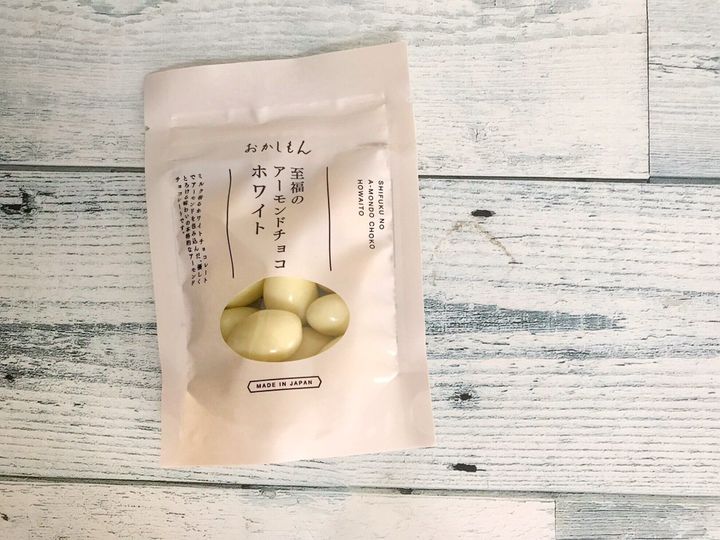 甘いチョコレートが好きな人に特におすすめの「おかしもん 至福のアーモンドチョコ ホワイト」(324円)。