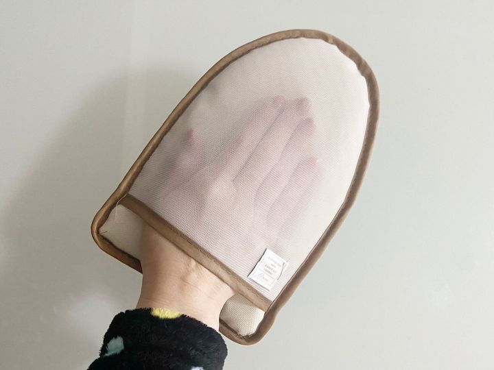 「スリムアイロングローブ」(330円)はハンガーに衣類をかけたままアイロンすることが出来るグローブ。アイロン時間を短縮できるだけでなく、広げてアイロンすると難しい細かい箇所もアイロンしやすいのがうれしいポイントです。お出かけ前に気になる箇所だけアイロンするのにもピッタリ!スリムなデザインなので収納場所も最小限で済みます。ちなみに筆者は「アイロンマットバッグ」にアイロンと一緒に収納しています。