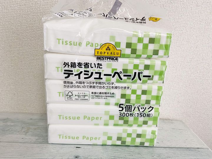 「外箱を省いたティッシュペーパー」(250円)はその名の通り、パッケージを出来る限り簡素化し、ごみを減らすことができる消耗品です。イオンのトップバリュでは、限られた森林資源を守るために適切に管理された森の木材を使い生産された紙製品や紙包材の商品を提供しているサステナブル商品が数多く販売されているので、出来る限り意識して購入するようにしています。