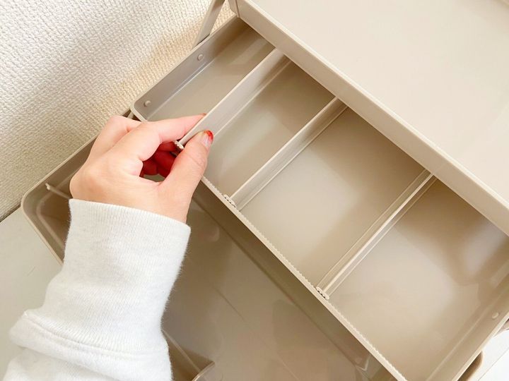 ちなみに筆者はツールボックスを2個買いしたのですが、1つは工具用にしているので仕切り板はほとんど使わず、薬箱として使っているツールボックスに2つ分の仕切り板を(8枚)使用し細かく分けています。