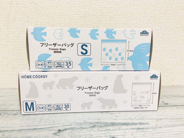 イオンホームコーディの人気アイテムのひとつ「フリーザーバッグ」(各327円)は、筆者もリピートしているお気に入り商品。しかも1月20日に店舗で購入した時はセール価格で2個購入すれば550円に!これは買うしかないと思い、ストックとして新たにSサイズとMサイズを追加購入しました。