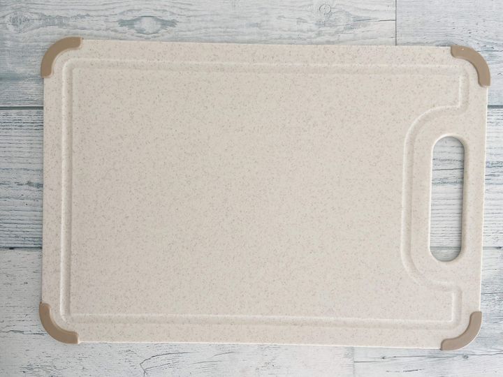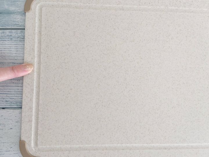 サイズは約縦24×横35×厚み0.8cm。薄すぎず分厚すぎずの厚みは食材をカットしやすい!筆者はずっと薄いまな板を使っていたのですが、厚みがあるだけでこんなにも違うのか……と感動。しかもこのまな板、四隅にすべり止めがついているので、まな板が動く心配がありません。滑り止めもベージュのまな板に合わせた薄いブラウンを採用していて見た目もおしゃれ。