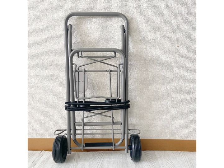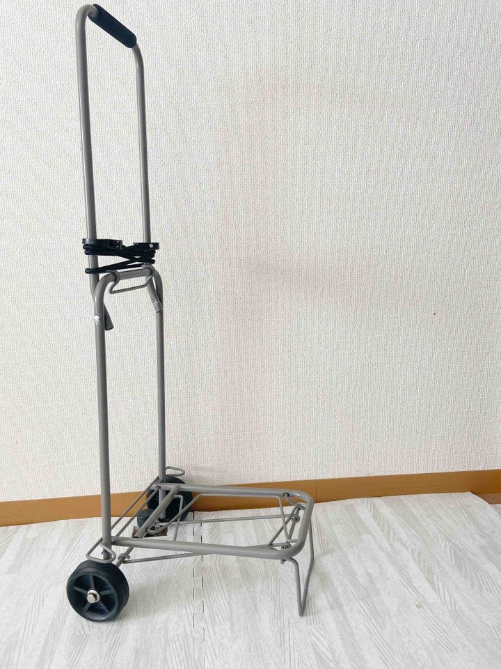 サイズは折りたたんだ状態で約縦51×横31×マチ9.5cm。使う時は持ち手が1mほどになります。耐荷重は約12キロと割としっかり荷物を運ぶことが出来るのに1,100円というプライスはなかなかの破格。他のメーカーのものだと同じような性能なら安くても3,000円前後はしているものがほとんどです。