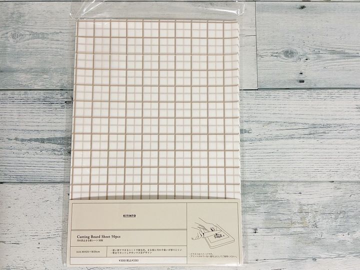 プリントされていない面を上にしてまな板の上にシートをセットし、その上で食材をカットすることでまな板の汚れを最小限に抑えることが出来る「【KITINTO】汚れ防止まな板シート:50枚入り」。前デザインはおしゃれな葉っぱのような線画だったのですが、等分でカットしやすいマス目のデザインにリニューアル。さらに便利に進化しています。