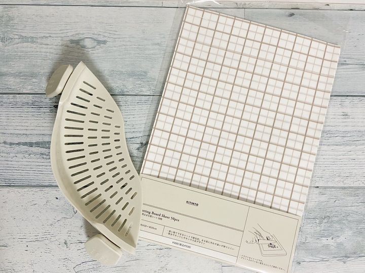 「【KITINTO】汚れ防止まな板シート:50枚入り」(330円)はリニューアルした大ヒットアイテム。前タイプから常に自宅にストックしている3COINSマニア主婦がデイリー使いしているキッチンアイテムです。