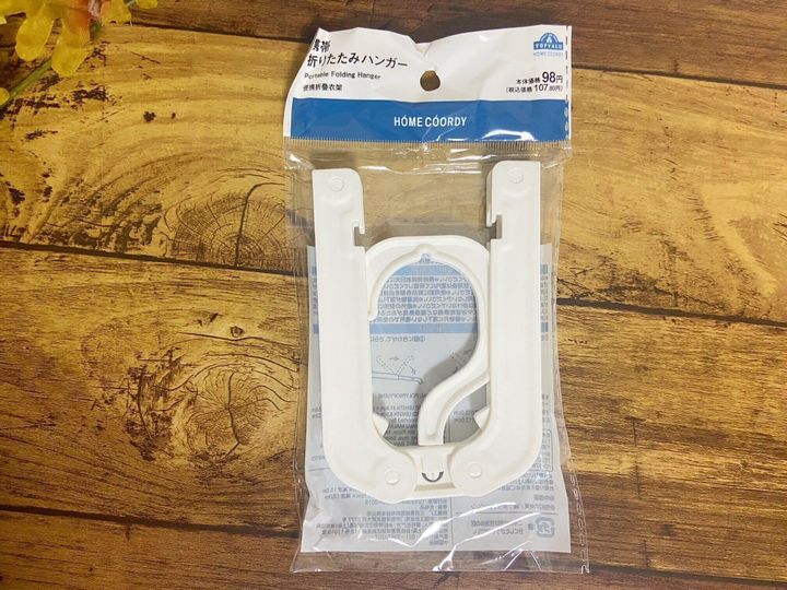 「携帯折りたたみハンガー」(107円)はその名の通り、携帯することが出来る折りたたみハンガー。1つ107円で販売されていたのですが、2024年2月16日現在、筆者が足を運んだイオンではセールで3個で100円にプライスダウンしていました。