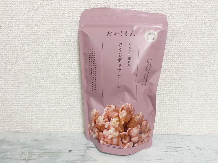 「しっかり絡めたさくらポップコーン」(270円)は、おかしもんで人気の高いポップコーンのさくら味。おかしもんのポップコーンは一粒一粒にソースが絡まっていて味がしっかり濃いのが魅力的。甘くてちょっぴり酸っぱいさくらの味をしっかりと感じることが出来るスイーツです。ついつい食べ進めちゃう……。
