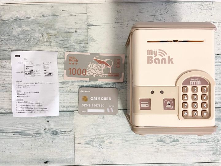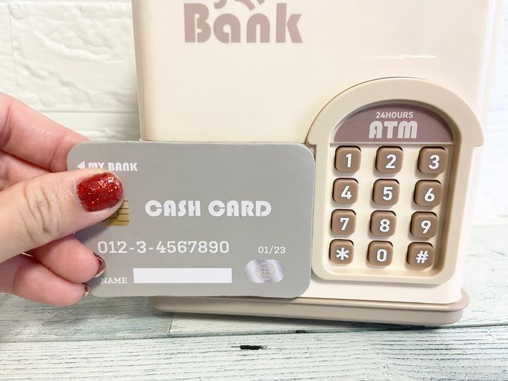 「電子貯金箱」は貯金の引き出し方が本物のATMみたい!付属のキャッシュカードをかざすと音がなって解除され、中のお金を引き出すことができます。