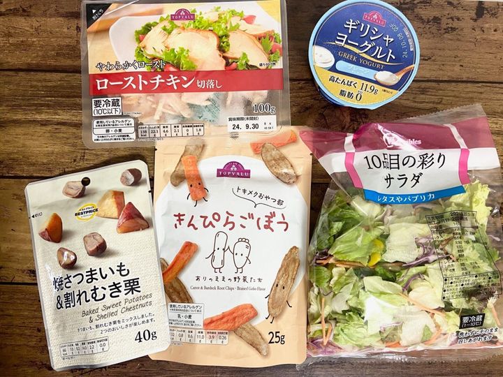 プライベートブランドトップバリュから販売されている「トキメクおやつ部 きんぴらごぼう」と「焼きさつまいも&割れむき栗」を盛り付ける。