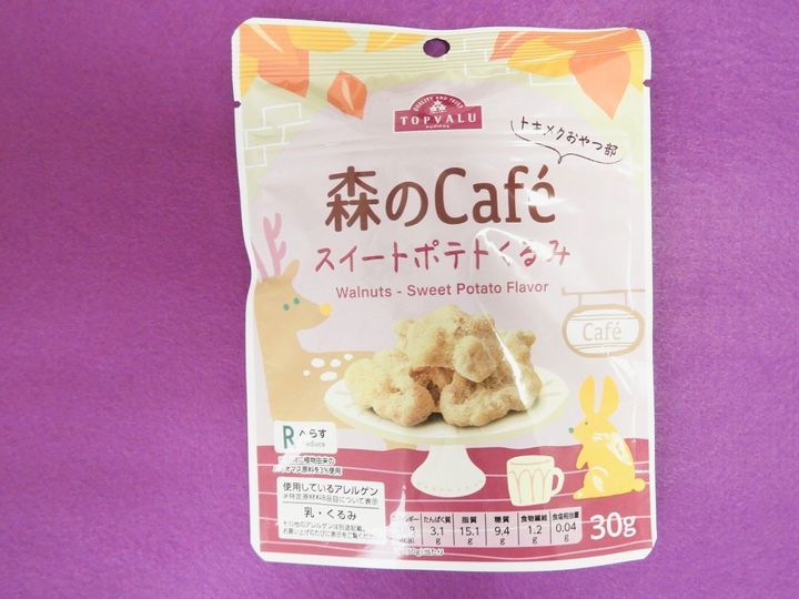 「トキメクおやつ部 森のCafe スイートポテトくるみ」(213円)は、素焼きくるみに安納芋パウダーで味付けした程よい甘さにホッとできるおやつ。