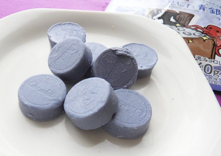 チョコレートは鮮やかなブルーが特長的。味は甘いホワイトチョコレート味。1枚1枚が大き目で食べ応えのあるチョコレートです。