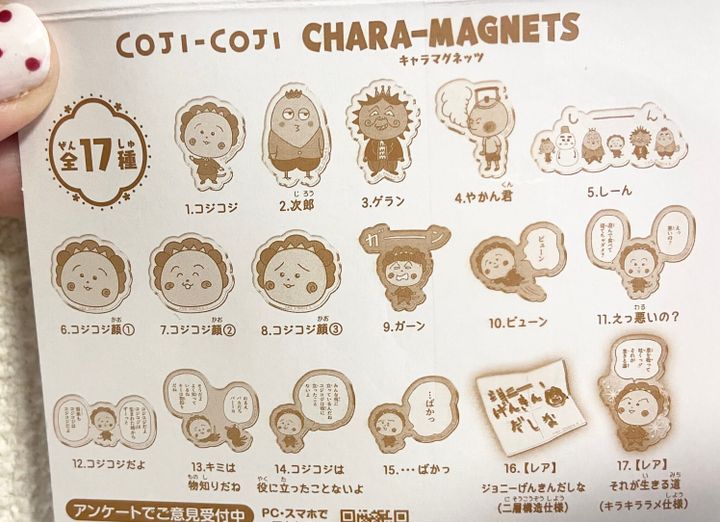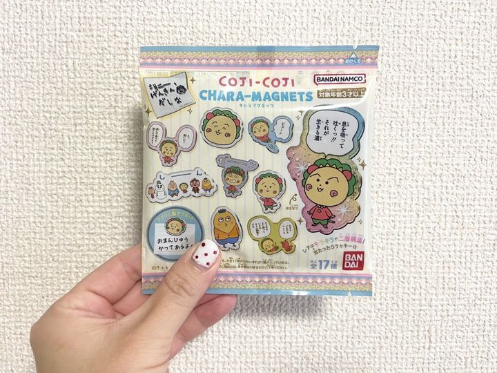 コジコジキャラマグネッツの公式サイトでは「全国量販店の菓子売場等で販売」と紹介されています。SNSでは・イオンなど大手スーパー・ファミリーマートなどのコンビニ・ヴィレッジバンガード・駿河屋などホビーショップ・一部書店の食玩売り場などで販売されていると目撃情報が投稿されています。筆者はイオンで購入しました。