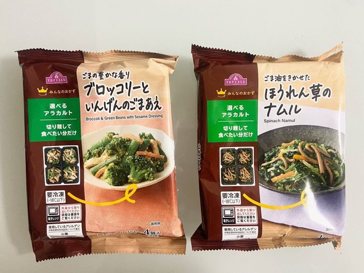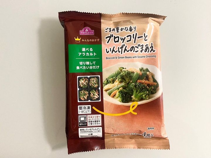 「ごまの豊かな香り ブロッコリーといんげんのごまあえ」(321円)は、ごまの香りが豊かな野菜(ブロッコリー、いんげん、にんじん)、油揚げ(大豆を含む)のごま和え。ブロッコリーは少々高くなっている野菜のひとつなので、冷凍食品でも食事に取り入れることができるのが1番のおすすめポイントです。