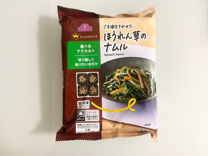 「ごま油をきかせた ほうれん草のナムル」(321円)は、ごま油がきいた野菜(ほうれん草、にんじん)、切干だいこん、ぜんまい水煮のナムル。冷めてもおいしいのでお弁当のおかずとしても重宝します。味がしっかりついているので白米との相性も抜群!