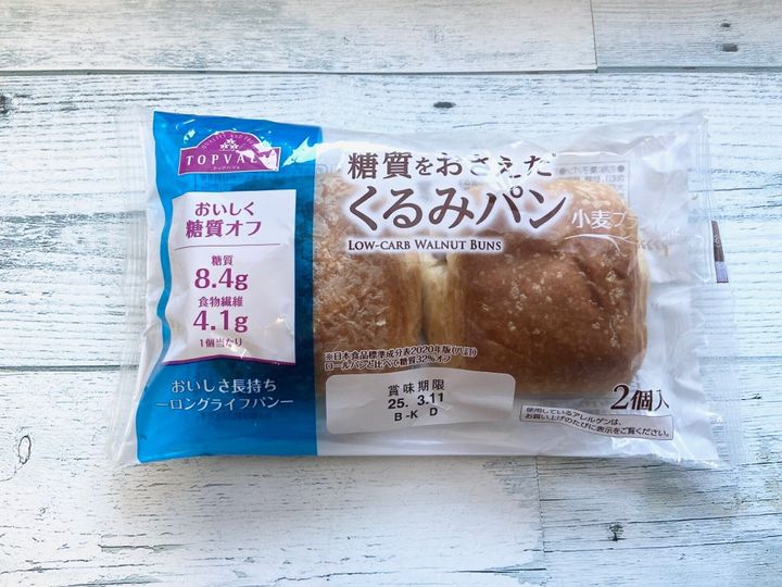 おすすめのパン3つめは「糖質をおさえたくるみパン」(181円)。大きなくるみがゴロゴロ入っている贅沢なパンです。1個(32g)当たり152kcal、糖質8.4g。日本食品標準成分表2020年版(八訂)ロールパンと比べて統一32%オフ。満足度高めのパンがいい人にピッタリ!