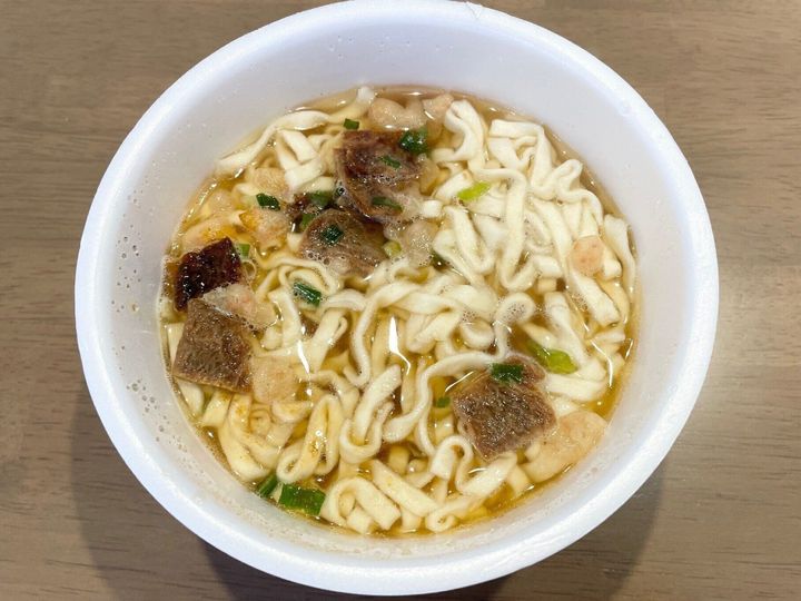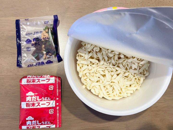 熱湯を注いで約5分で完成!見た目は他の肉うどんのカップ麺とあまり変わりがない印象です。