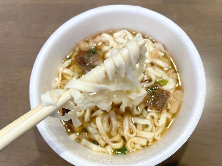 もちもちの噛み応えのあるふっくらとした麺はカップ麺の中でも割と満足度の高いクオリティ。