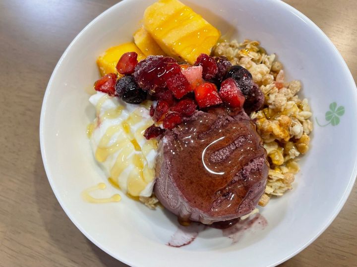 「お家でアサイーボウルS」をそのまま食べてもおいしいのですが、筆者のおすすめはグラノーラとヨーグルトにトッピングして食べるアレンジ。グラノーラに無糖ヨーグルト、冷凍フルーツ、「お家でアサイーボウルS」をトッピングし、はちみつをかけて食べればボリュームも満点! 見た目もかわいいので、朝食にすればおなかを満たしてくれるだけじゃなく、朝から気分も上がります。