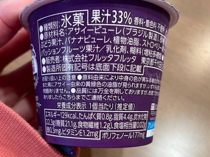今回購入した「お家でアサイーボウルS」(税込375.84円)は、2025年4月14日(月)より、冷凍食品専門店「@FROZEN」15店舗で先行販売が開始、4月21日(月)から、関東・北陸信越・東海・近畿・中四国の「イオン」「イオンスタイル」にて販売開始された新作スイーツ。1個110mlと手のひらサイズの食べきりやすいサイズ感です。