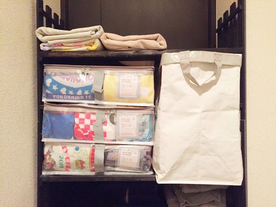 小さめのハンドタオル、大きめのハンドタオル、フェイスタオル、手ぬぐいやバンダナ等を一つの袋にまとめて収納していたのですが、だんだんごちゃごちゃになってきてどうにかしたいと思っていたので早速使ってみました。