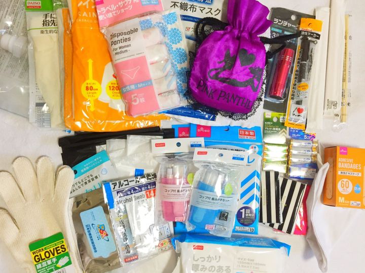 DAISOで買ったものは・使い捨てのゴム手袋・レインコート・使い捨て下着・タオル・懐中電灯・油性マジック・ゴミ袋・アルコール消毒綿・歯ブラシセット・簡易トイレ・電池・ばんそうこう・三角巾・大きめのウエットティッシュ。