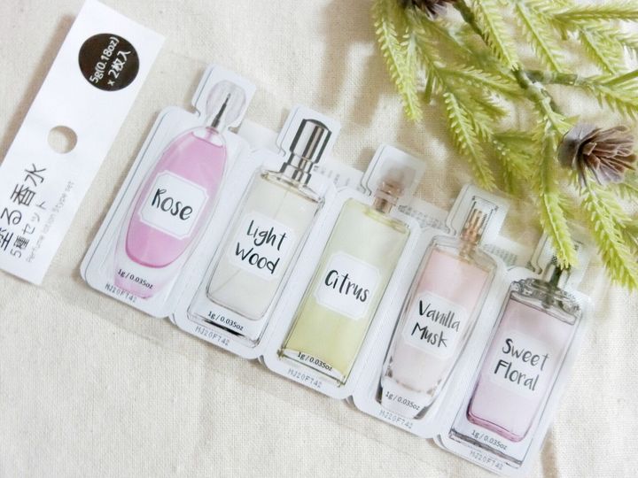 ローズ(豊かなバラの香り)、ライトウッド(中性的な香り)、シトラス(さわやかな香り)、バニラムスク(あたたかくやわらかな香り)、スイートフローラル(甘い花の香り)の5種類の香りがセットになっているので、気分やファッションに合わせて香りを選べるので、さまざまな香りを楽しむことができます。