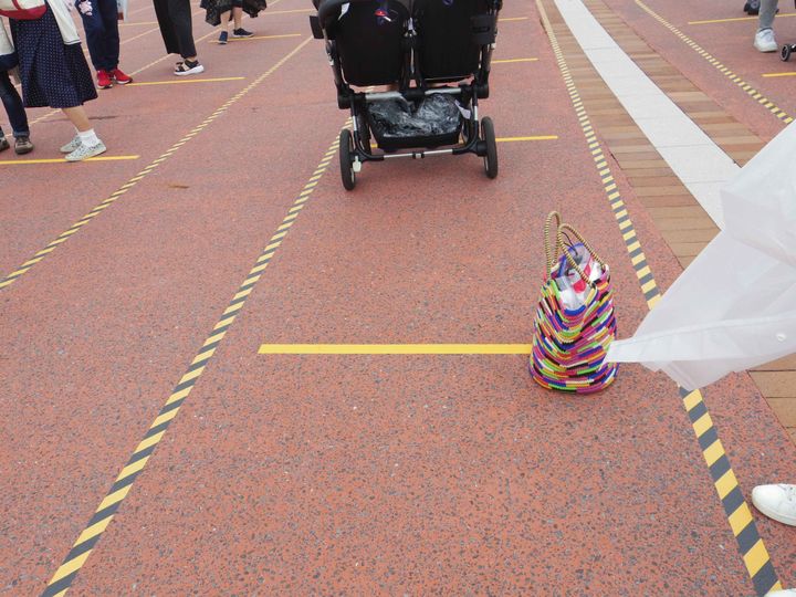 人数よりもはるかに多くソーシャルディスタンスの目印になるラインがひかれていました。