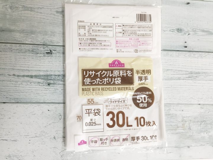 イオントップバリュの「リサイクル原料を使ったポリ袋」はリサイクル原料を50%使用しているので、まったくリサイクル原料を使っていないものを使うよりはいいかなと思い愛用しています。