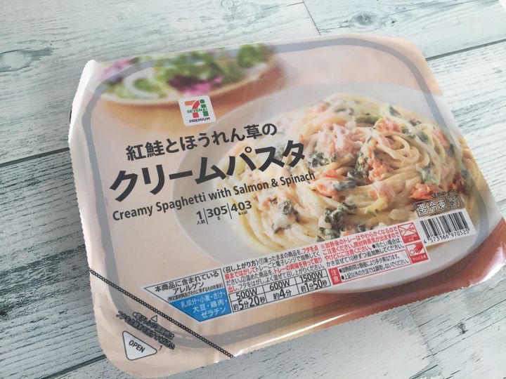 今回紹介する「紅鮭とほうれん草のクリームパスタ」も税込み321円なのでお弁当よりコスパがいいです。